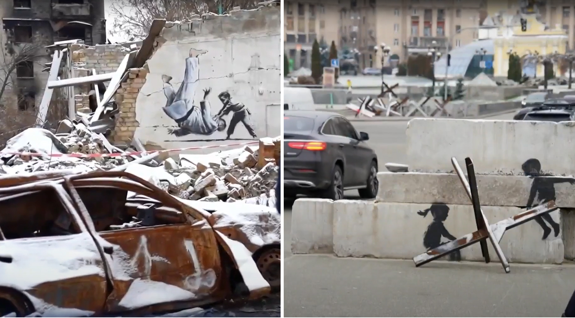 Hai tranh tường của Banksy ở Ukraine. Bên trái là cậu bé Ukraine vật ngã võ sư khổng lồ. Bên phải là hai cậu bé nghịch trên xích đu là các giá súng đại bác.