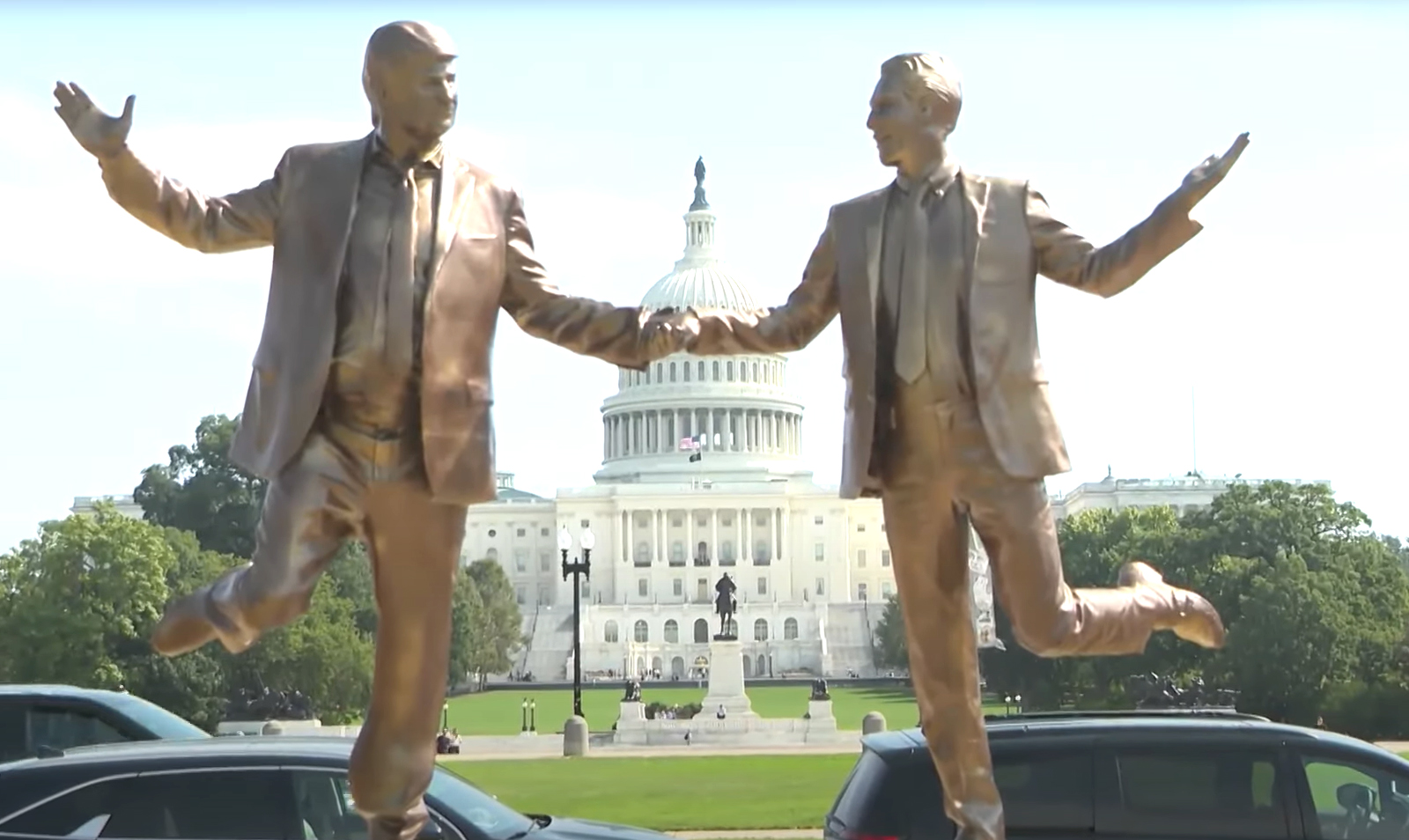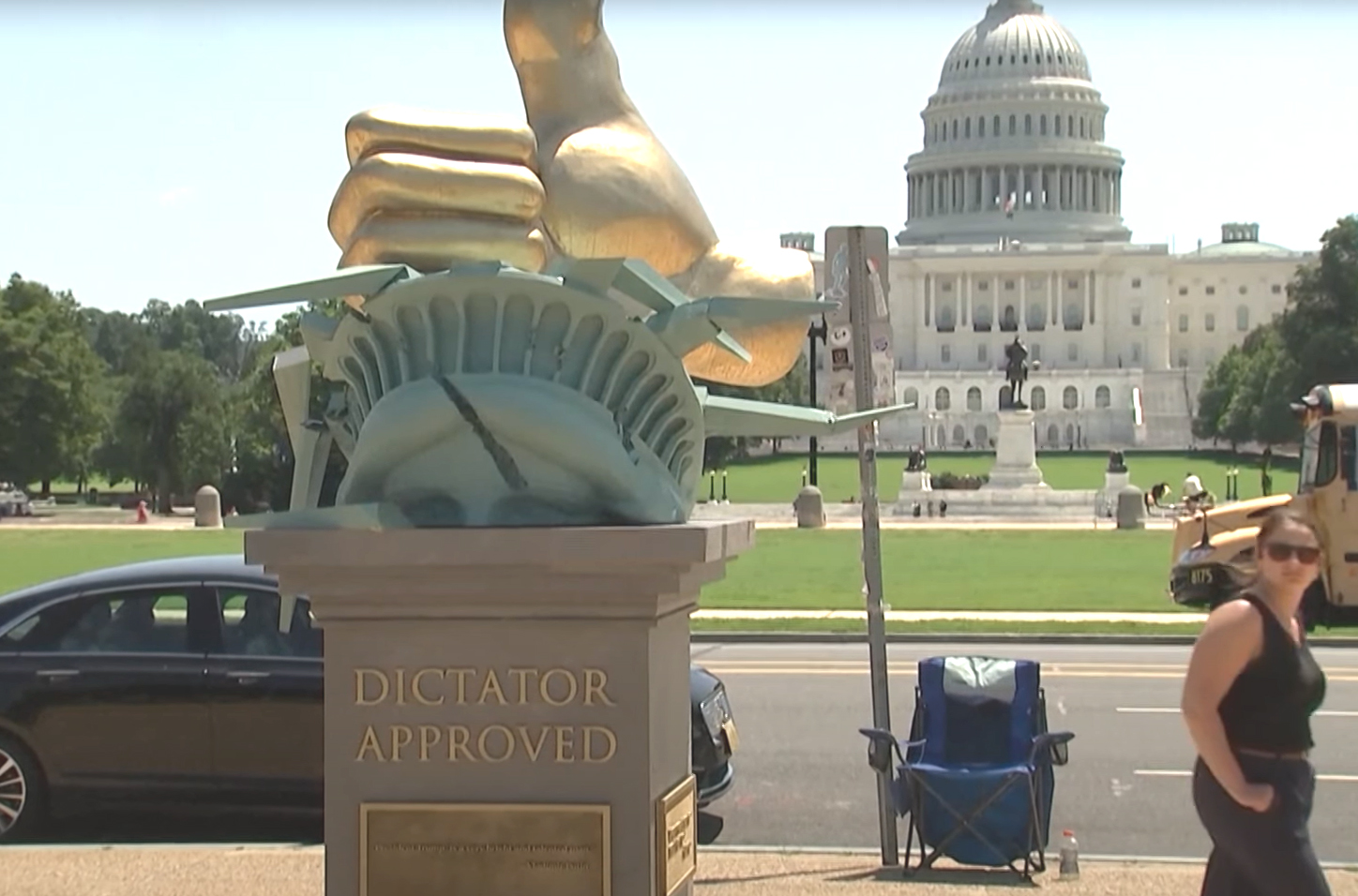 Một nhóm có tên là Dự án Bắt tay Bí mật (Secret Handshake Project) tự nhận đã thực hiện tác phẩm nghệ thuật phản đối bất ngờ này, đây là tác phẩm nghệ thuật phản đối Trump thứ ba xuất hiện tại thủ đô kể từ tháng 6/2025. Nhóm này cũng đã dựng nên tác phẩm được gọi là Được Nhà độc tài chấp thuận (Dictator Approved), một tác phẩm điêu khắc cao 2,4 mét hình bàn tay đang đè bẹp vương miện của Tượng Nữ thần Tự do trong khi giơ ngón tay cái lên; và tác phẩm sắp đặt đa phương tiện “Tượng TV Vàng” (Gold TV statue), trong đó một chiếc TV vàng chiếu hình ảnh Trump đang khiêu vũ, bao gồm cả với Epstein.