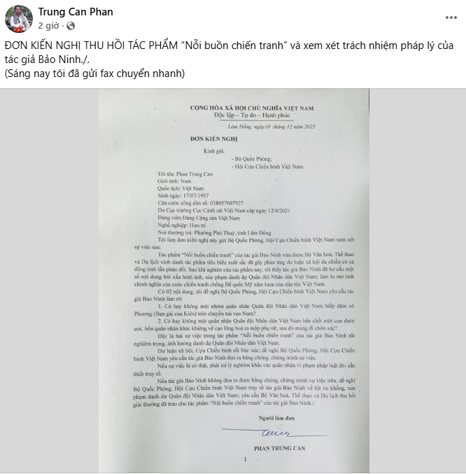 Cuốn Nỗi buồn chiến tranh của nhà văn Bảo Ninh đã có ĐƠN KIẾN NGHỊ thu hồi của một người rất yêu sự thật và công lý gửi các cơ quan chức năng.