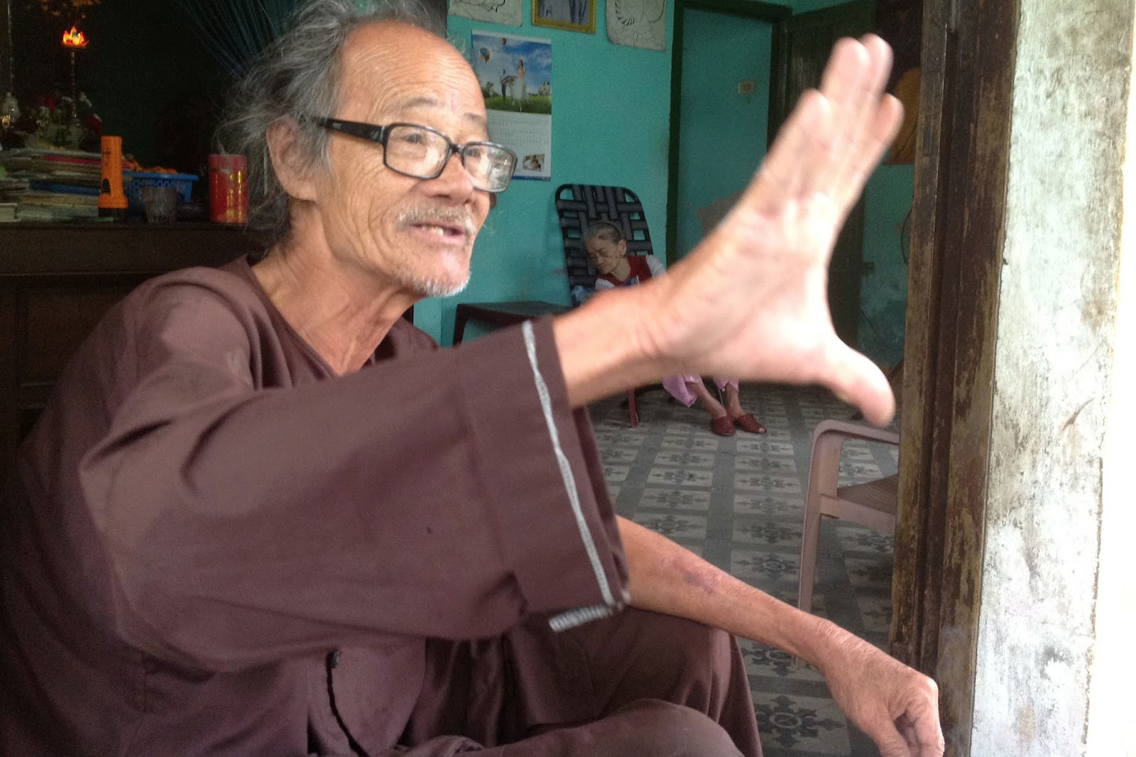 Nhưng đụng chuyện gì lại kéo anh em hỏi nhỏ ông Điềm nói răng không ông Điềm nói răng không. Có lần hỏi mình, mình nói anh thân anh Điềm sao không hỏi anh ấy đi. Anh nói mấy hôm thấy mặt ông Điểm lầm lầm, tui không dám kêu thằng, kêu anh thì trẹo lưỡi, cực rứa chớ.